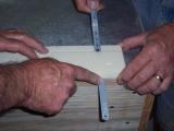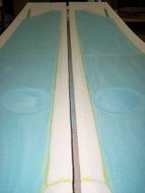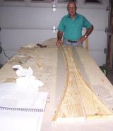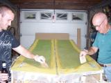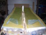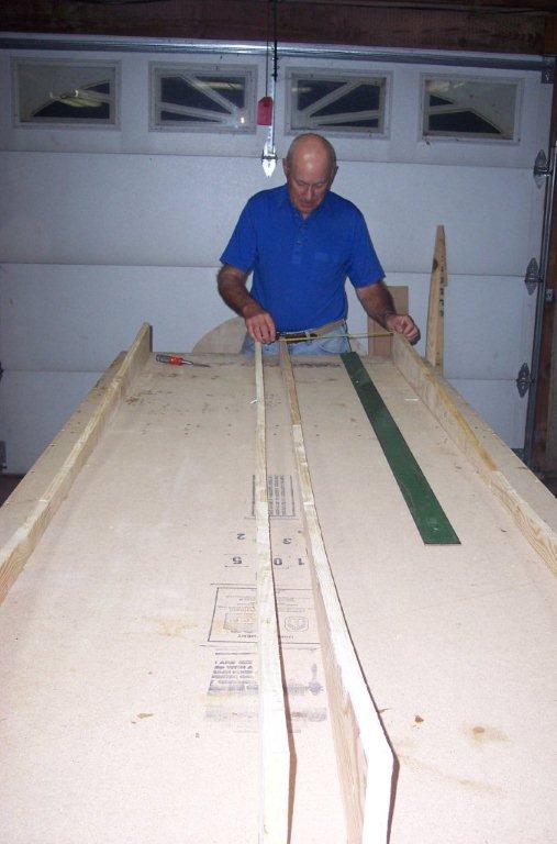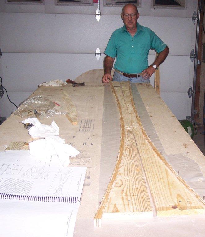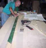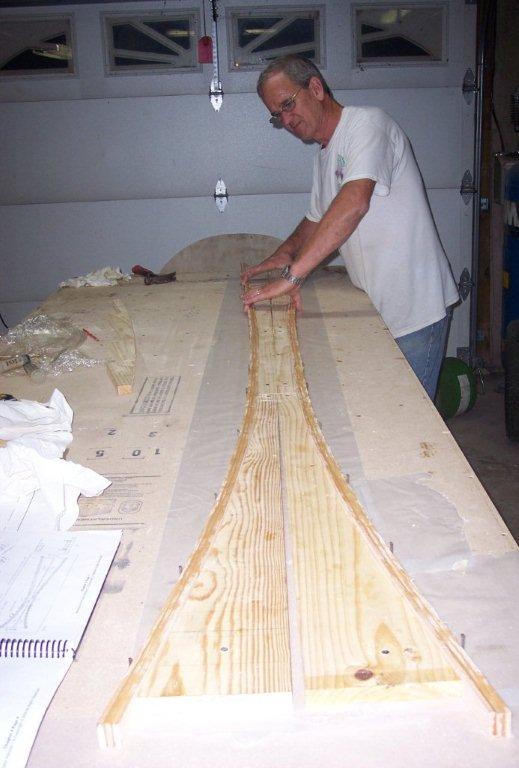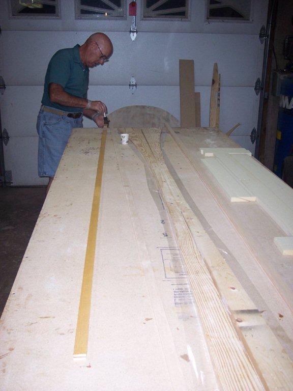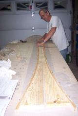 In this photo we are putting resion on the three strips of birch wood that will become the upper longeron. They are going to be placed together and tightly pressed together next to the forms that you cut earler to make the right conture for the upper longeron. They will be held tightly to the form by driving many nails into your table on the open side of the strips to let they harden so they will keep there shape. |