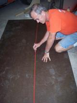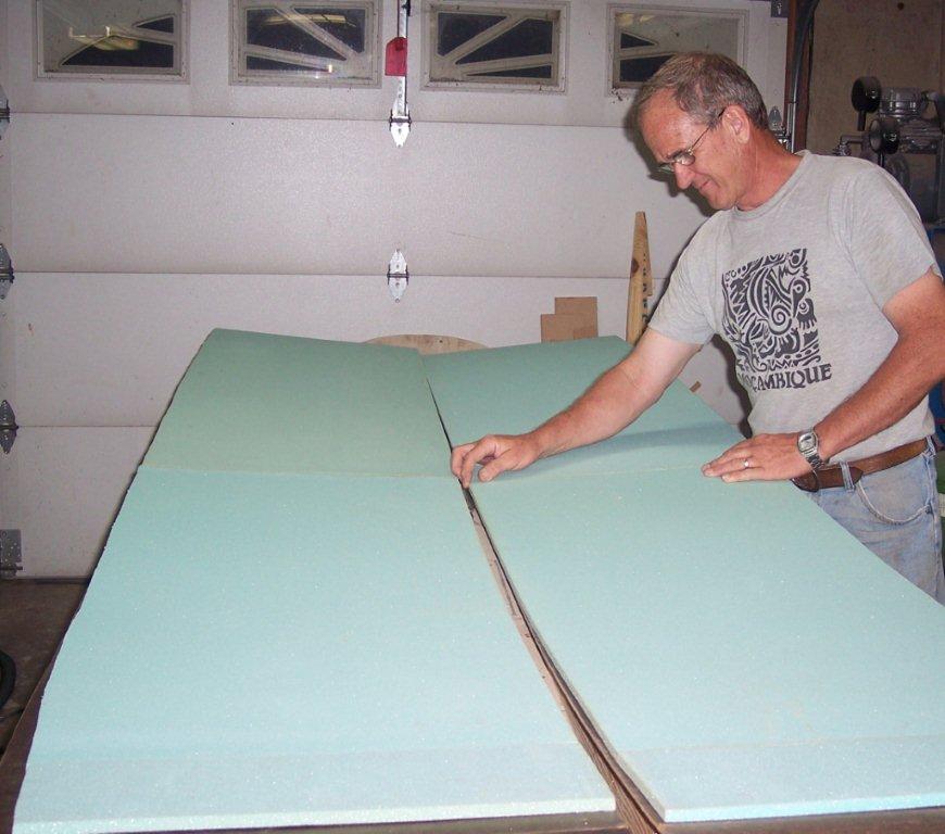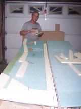 | Now we are getting ready to cut the foam that is going to be attached to the foam that we just attached to the masonite in the previous step. The plans book tells you where to draw the lines to get the right angle when cutting the foam. I found that the easiest way to do this is to lay a piece of straight metal along the edge of the work table. I used a sheet of metal that I got from a heating/cooling company that had a a straight edge and was about three feet long. Place the line on the foam that is the farest out of the cut you are making is on the edge of the metal. On the line that is lined up on the metal on the table, bring the line up the side of the foam a little so you can see it without having to look up under the foam to see if you have it lines up. Then take a hack saw blade in your hand and place the blade agains the metal on the table and line the top of the blade with the line on the top of the foam. Cut away, doing this you will have the perfect cut. |