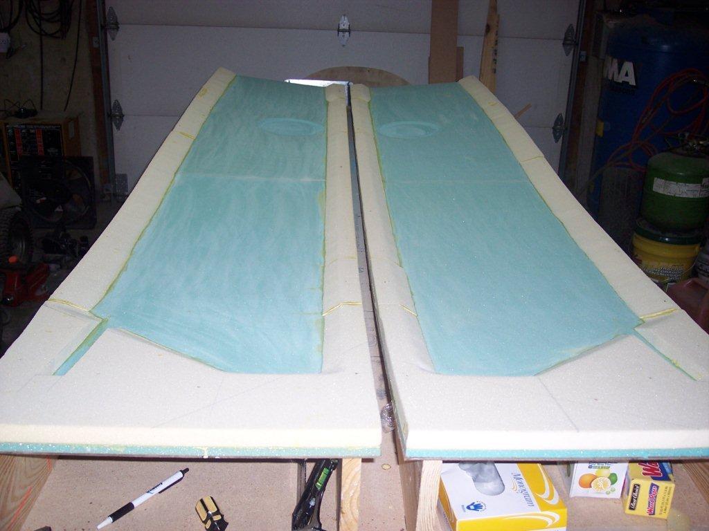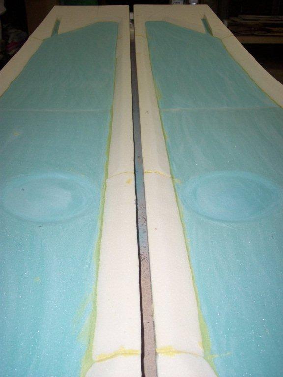 Here is the fuselage with the foam microed to the blue foam and the circles placed in the sides of the blue foam. |