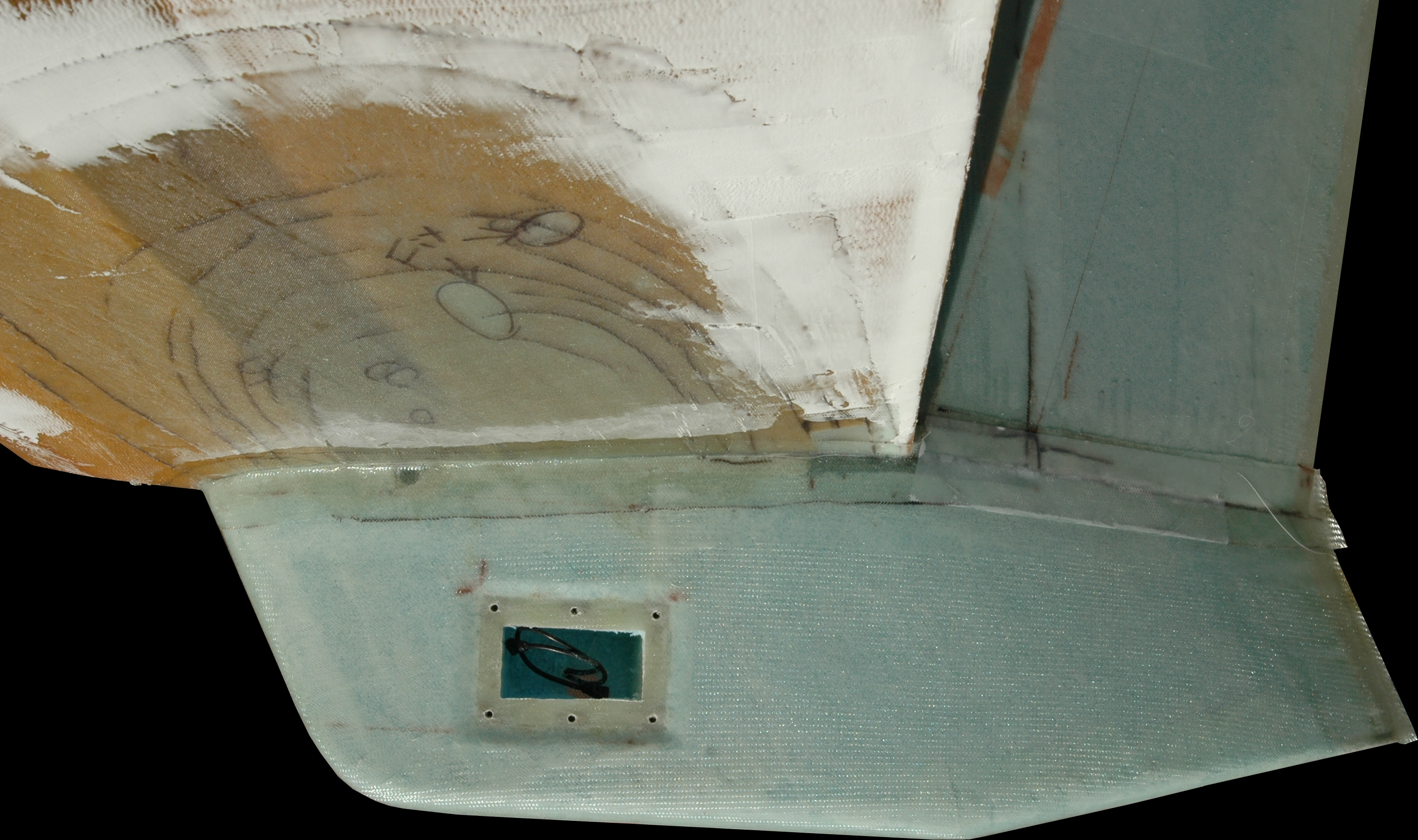 Right - is the lower right winglet. Note the hole cut out for the fixed cameras. The plan is to mount two ground adjustable cameras in this hole and aim one at the nose/canard area. The second camera will be aimed at the engine area. As these cameras are cheap light, we figured this was a very easy way to visually inspect our airplane from the air. Two additional cameras will be use on the plane: One will mount in the roof of the rear cabin and aim forward -- kind of like a cockpit recorder (we'll probably take our audio from the intercom system). The last camera will be mounted on the left winglet facing forward. This last one is the larger Sony bullet camera and will be mounted on a car mirror gimbal so we can aim it wherever we desire from within the cockpit. We plan to hook the whole system to a small DVR.