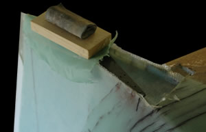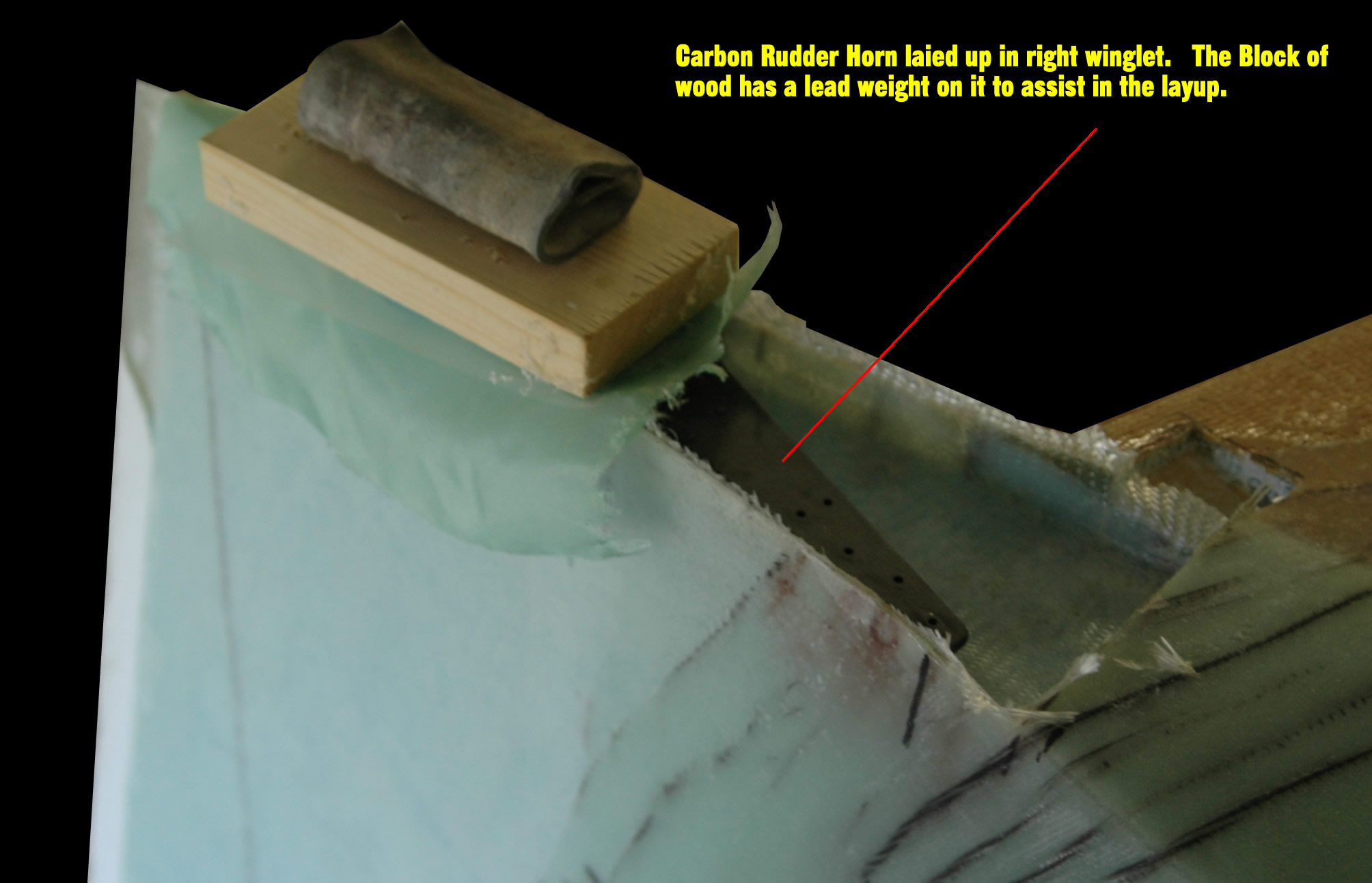 While the winglet is upside down on the sawhorse and before we've cut the rudders, we've placed our new hidden rudder horn. This horn Rob made from 24(?) plys of carbon. We've been warned about hardware in contact with the carbon so we're doing a little research before we attach any control sources to the carbon. We'll let you know what the jury says after our research is done. One thing is for sure, that part is STRONG and very light.