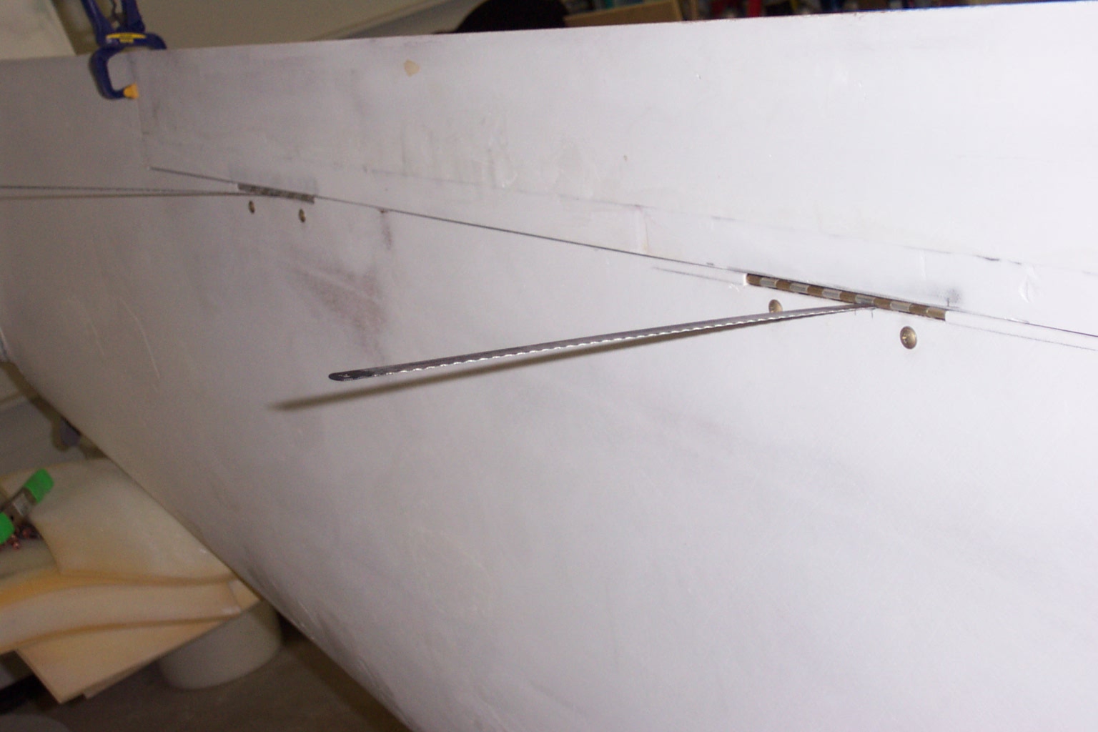 Right— In late October 2007, we cut the first Aileron out on the left wing. As you can see from the picture at the right, the cut lines came out real clean. The initial cut was made with a Fein Multimaster Saw.