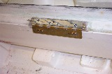 Now we're ready to mount the hinges. The manual is pretty clear on most of this procedure. The two pictures below show the early stages of test-fitting and mounting the hinges. Note the Clecos used to hold the hinge in place while nut plates are marked and added to the hinges. The second picture shows how we tacked the hinges to the ailerons. This is the process of cutting tiny slots under one of the hinge arms and then using a hacksaw blade to push the other half of the hinge up into some Bondo that was placed on the aileron in hopes of getting everything aligned and tacked in place.