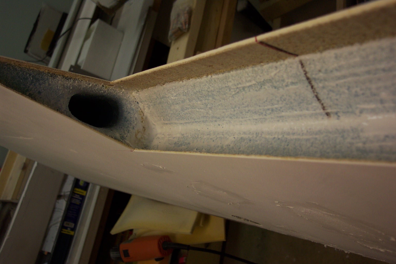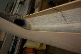 At right, we have our cleaned up Aileron cutout. As stated above the inside edges of the wing skins were cleaned up using our router tool above. The manual/DVD states that we are to look for the peel-ply on the inside skins and remove them. We never found any peel-ply on our wing cuts. Just to be sure, we made some pretty deep cuts with our Dremel tool just to make sure we didn't miss the peel-ply.